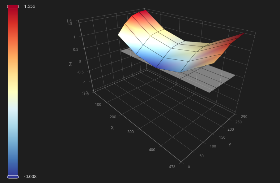 The following image shows the result of a coarse measurement of the baseplate's surface using jubilee's probe tool. A maximum deviation of 1.5 mm can be observed, and revealing that the baseplate can be somewhat saddle-shaped instead of mostly flat or just tilted.